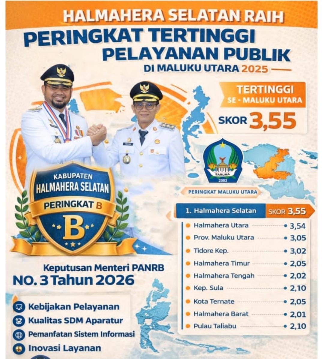 Di bawah Halsel, Pemkab Halmahera Utara menempati posisi kedua dengan skor 3,54, disusul Pemerintah Provinsi Maluku Utara dengan skor 3,05 dan Kota Tidore Kepulauan 3,02. Sementara sejumlah kabupaten/kota lainnya masih tertahan pada skor 2 dengan predikat C, menandakan masih adanya jurang kualitas pelayanan publik antarwilayah.